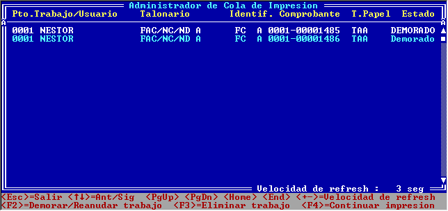 Un trabajo se encuentra en estado Esperando cuando se realizó la emisión de un comprobante a Archivo – Cola de impresión y el mismo no era el correlativo al último grabado o se encontraba en estado Demorado y se digitó <F3>
