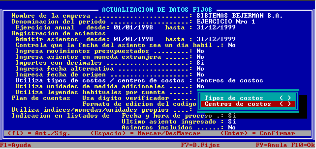 Ante la consulta ‘Utiliza tipos de costos/centros de costos’ indicar que se utilizará centros de costos, marcando esta opción con la barra espaciadora. Esta parametrización permitirá la distribución de los importes de las cuentas, de acuerdo a porcentajes indicados en el Plan de Cuentas.