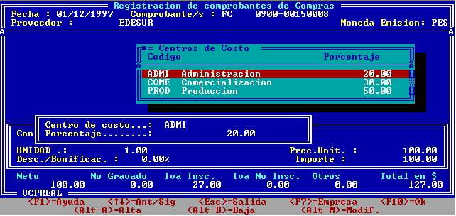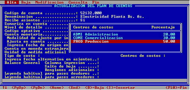 En la opción Centro de costos, indicar los códigos de centros de costos (o seleccionarlos de la ventana que se presenta con <F2>) y los porcentajes pertinentes.
