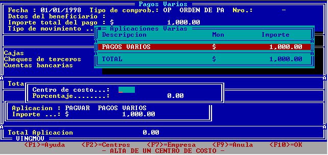 Al efectuar un pago vario, sólo se pueden registrar movimientos de fondos cuya aplicación sea "Aplicaciones varias".