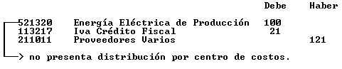 Como ítem del comprobante se indica un concepto que tiene asignada la cuenta Energía Eléctrica de Producción. El importe de la factura es de $100 + IVA: $21.